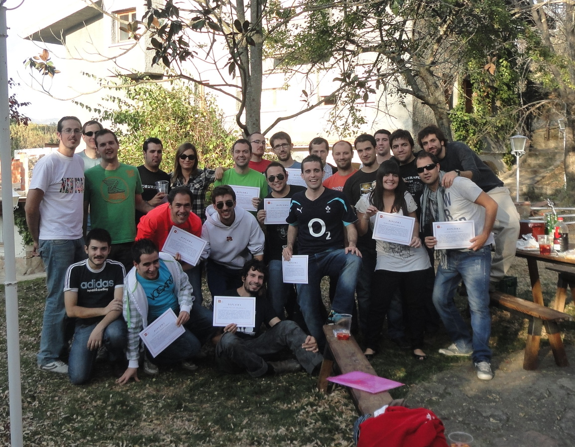 Organizamos un fin de semana en la casa rural de un pueblecillo de Ávila, Navaluenga. Hicimos varias actividades planificadas: Paintball, parrillada, póquer… y otras improvisadas: recogida de leña, lanzamiento de objetos a una gran masa de agua, avivamiento de fuego… pero sobre todo,lo pasamos estupendamente entre risas, historias de todo el mundo, cerveza, karaoke, bailes, futbolines…