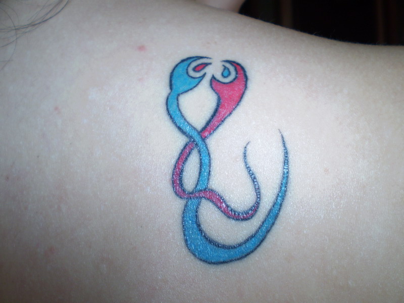 Ahora no me acuerdo exáctamente la idea con la que lo dibujé, han pasado unos cinco años aproximádamente pero me suena que quería representar una especie de “ying-yang” por la realimentación y la alternancia de colores de dos figuras pseudo humanas bailando. Y por cosas de la vida, cinco años después de ese delirio plasmado en papel, me enteré que una amiga había decidido marcarse para siempre con dicho dibujo…