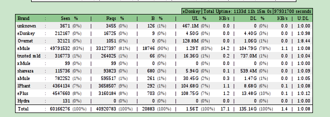 As you may remember four years ago I writed about an script which was in charge of setting automatically your MLDonkey rates in order to not overload your bandwith according to the number of clients in your local area network. This script has been running for almost four years and has been a really helpful in achieving the following stats: