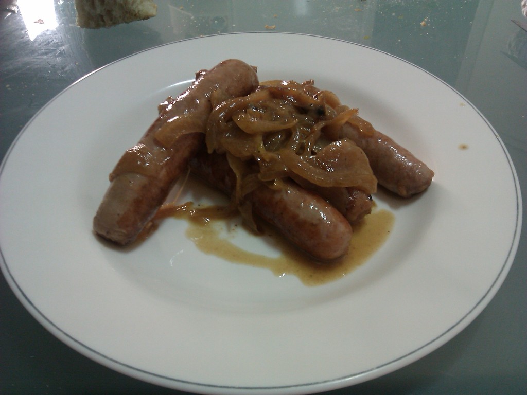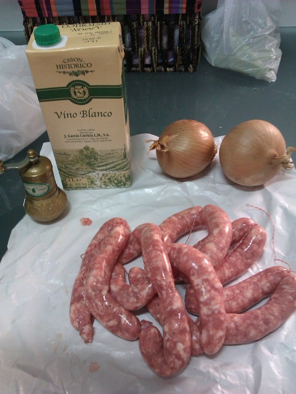Cortaremos las cebollas a trozos grandes, yo la parto por la mitad y luego a tiras de medio dedo de anchura. Cuando tengamos las dos cebollas cortadas, las echaremos al aceite de la sartén (con todo el jugo) a un fuego bajito y las tendremos un buen rato, unos 15-20 minutos dándole vuelta constántemente para que vayan pochándose. Cuando estén transparentes echaremos un poco de sal, volcaremos el plato con las salchicas, unos cuantos granos de pimienta negra (una cucharada) y un vaso de vino blanco. Dejaremos cocer hasta que se haya evaporado casi todo el vino y las salchichas se hayan impregnado de él.