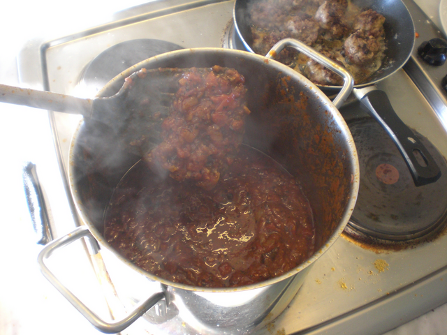 Hacerlo es muy sencillo, primero se corta y se sofríen un poquillo los ajos hasta que esté doraditos (con bastante aceite, no seáis rácanos que seguro que estáis rodeados de aceite de oliva y yo me tengo que conformar con usar vegetal… :( ). Luego se añade la cebolla troceada, el tamaño según os guste, a mi no me gusta excesivamente picada pero hay gente que prefiere evitar encontrarse trozos grandes. Cuando ya está pochadita (a fuego lento unos 20 minutos) se añade la sal y luego se echan las latas de tomate. Se pone el fuego al máximo o casi al máximo y se fríe el tomate. Añadir sal, pimienta, orégano y albahaca al gusto, a mi la albahaca me parece imprescindible pero allá cada uno con sus gustos. Si queréis corregir la acidez del tomate podéis echar una o dos cucharillas de azúcar aunque yo prefiero ese toque ácido característico del tomate.