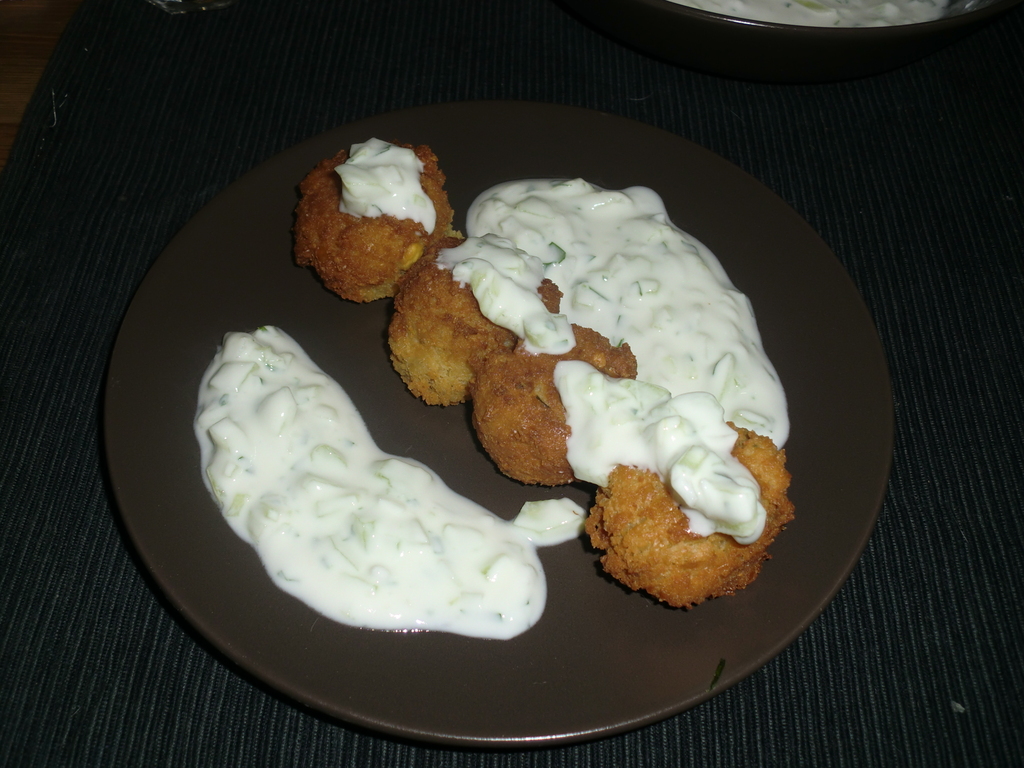 Se puede servir de muchas maneras, cuando yo lo hice no me curré mucho la presentación pero os pongo el plato a continuación. Podéis servir las bolitas frías o calientes, con la salsa por encima o en pequeños recipientes alrededor, sobre un lecho de ensalada o incluso en bocadillo (sonará raro pero está buenísimo). Os animo a todos a que probéis esta receta porque de verdad, el sabor es exquisito.