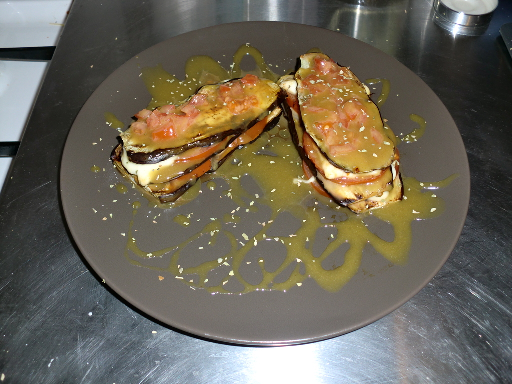 Cuando está todo cocinado solo faltará ir haciendo las torretas, para lo que se pone: loncha de berenjena, un poquito de sal, loncha de tomate, un poquito de sal, loncha de mozzarella, un poquito de orégano… y así repetidas veces hasta que estén las torretas bien montadas.