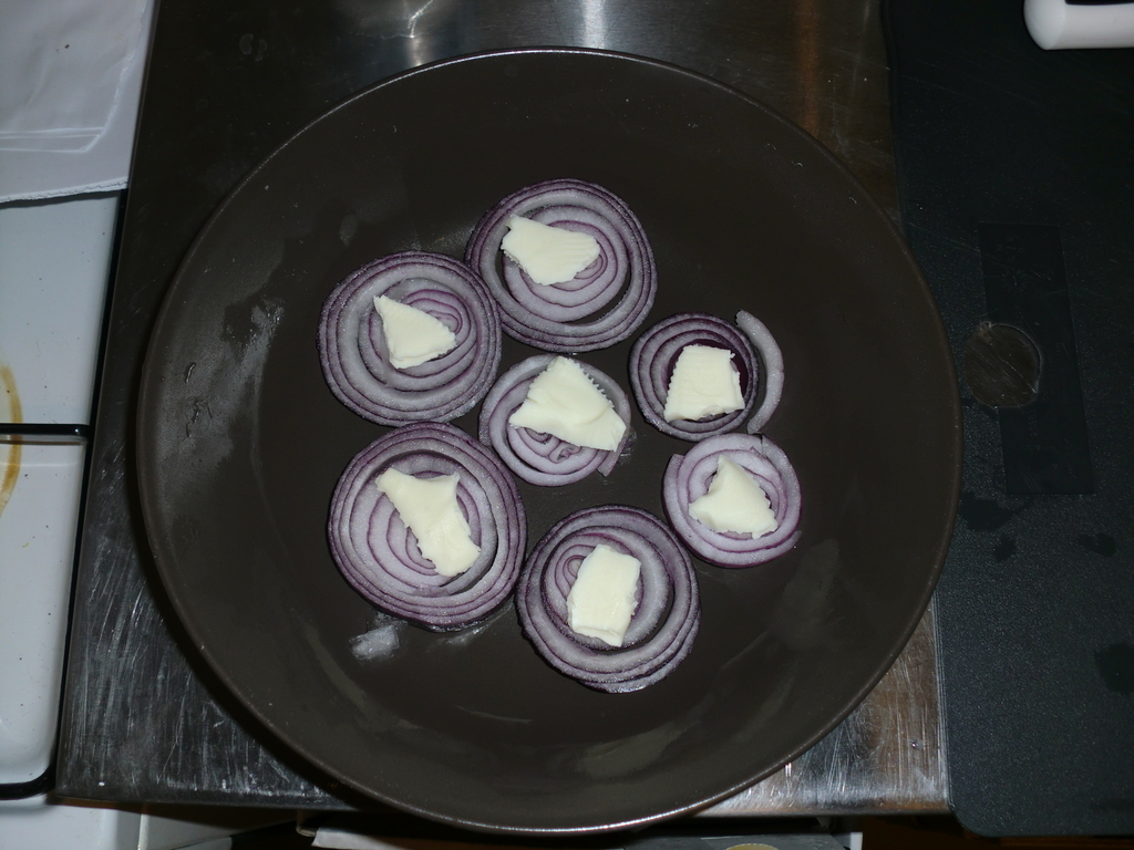 Ahora vamos a cortar la media cebolla a rodajas finas, se podría en juliana si preferís pero no quedará tan bonito (podéis hacerlo mientras se hacen los ajos, pero ¡id controlando!). Una vez que la tengamos cortada la pondremos en un recipiente apto para microondas (yo he usado un plato), cubriendo el fondo, y pondremos por encima un poquito de mantequilla en cada una y meter al microondas durante un minuto y medio más o menos.
