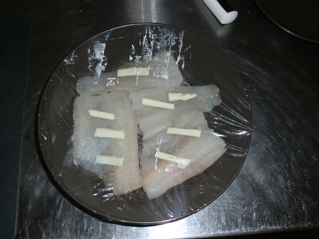 La cebolla debería estar casi hecha, pinchad con un cuchillo y que no llegue a estar ni muy dura ni muy blanda. Ahora salamos la cebolla, ponemos el pescado por encima, lo salamos y ponemos un poquito de mantequilla en cada filetillo de pescado. Solo quedar tapar con un film y meter al microondas durante un par de minutos más o menos. Yo no he pinchado el film y ha sacado mucho agua el pescado, creo que porque era congelado pero se puede probar a pinchar, iré haciendo pruebas.
