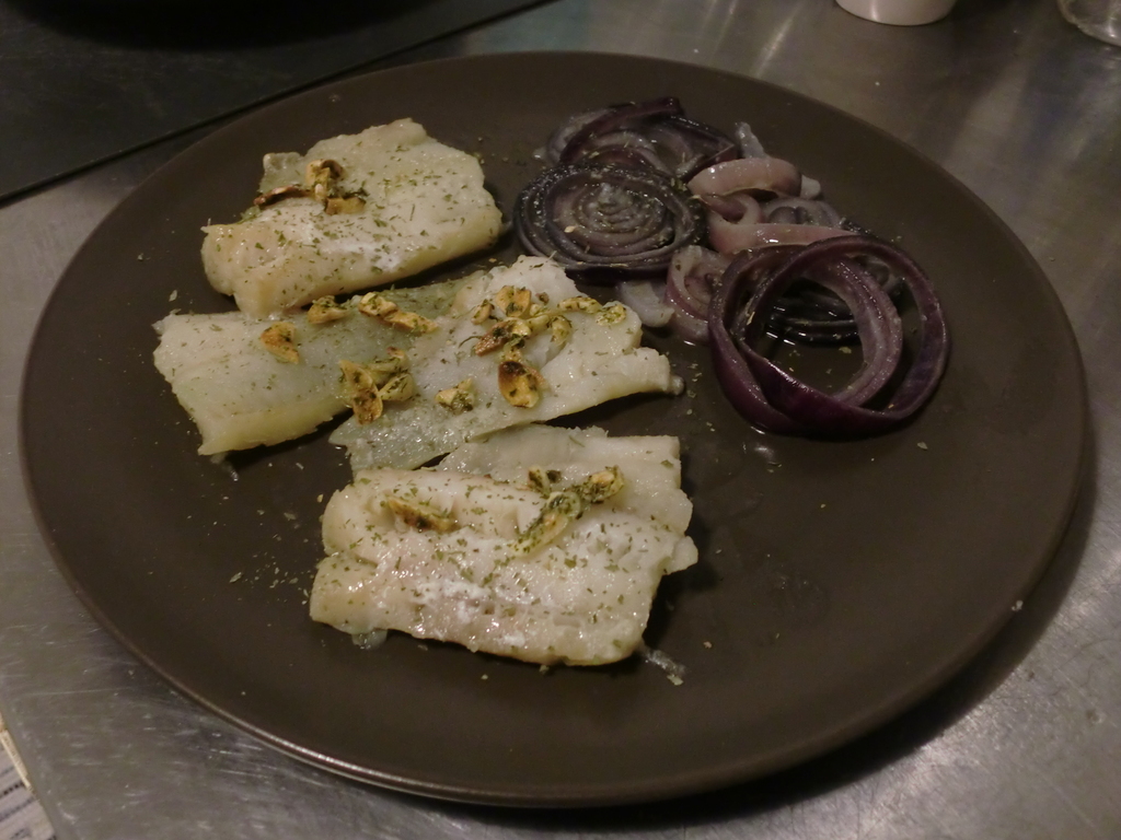 Sacamos con cuidado del microondas, si estaba tapado el vapor quemará bastante. Solo falta emplatar, se sacan los filetes de pescado por un lado y los aritos de cebolla por otro, por último ponemos encima de los filetes los ajos que habíamos reservado del principio y si queremos adornar ponemos un poquito de perejil por encima.
