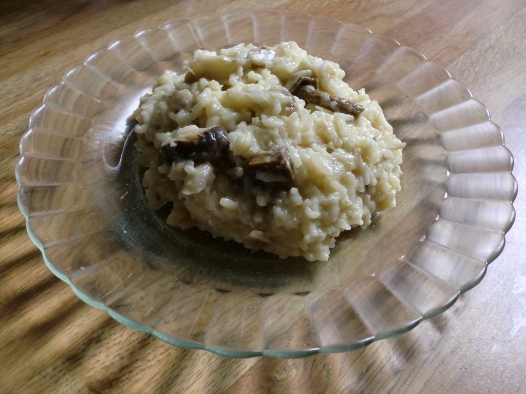 Cuando la cebolla ya está casi terminada, la salamos, añadimos las setas y subimos un poco el fuego para que pierdan todo el agua, cuando estén todas bien hechas añadimos el arroz a fuego un poco más fuerte para sofreírlo, por último echamos el vino y esperamos que se evapore mientras vamos removiendo.