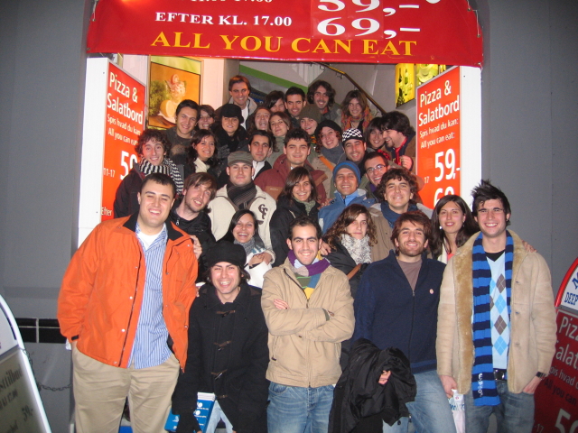El caso es que ayer, con motivo de celebrar la Navidad, despedirse de todos antes del regreso y el cumpleaños de Mara, se decidió hacer una cena que, tras varias discordias, se hizo en un restaurante del centro de Copenhague. El restaurante no estaba nada mal para el precio que pagamos (70 Kr - 10 €) por el buffet libre, aunque ya se sabe, en estos casos la bebida es lo caro. Nos costó mucho ubicarnos, ya que como buenos españoles y habiendo dejado todo para el final, no habíamos reservado y es difícil conseguir sentar a 32 (cifra aproximada) personas. Nos sentamos en diferentes mesas pero reinó un ambiente común, donde los pobres daneses sufrían al escuchar los alaridos provenientes de gargantas del sur de Europa, y es que otra cosa no, pero voceras somos.