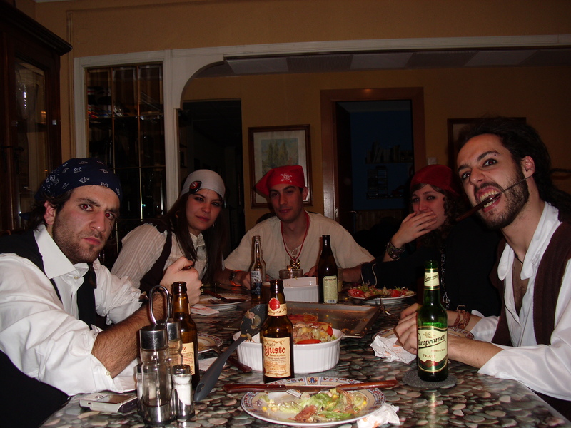 Nos juntamos para cenar en casa de Kua, Patri, Sara, Bea, Nacho y yo, donde tras una larga preparación de la cena, cenamos cual Piratas en un barco tras un buen botín. Comida abundante y no menos bebida, esta vez tocaba cerveza, el ron lo dejaríamos para luego. Salimos luego de marcha por los bares del casco de Zaragoza, ya algo entonados y con ganas de abordar algún que otro bar. Seguimos bebiendo y pasándolo extremádamente bien. Conseguimos pagar más de 18 chupitos con monedas de chocolate que habían costado menos de 2 euros, es lo que se consigue con un buen disfraz y una buena interpretación, y por supuesto un camarero con ganas de echarse unas risas y caer bien a la clientela.