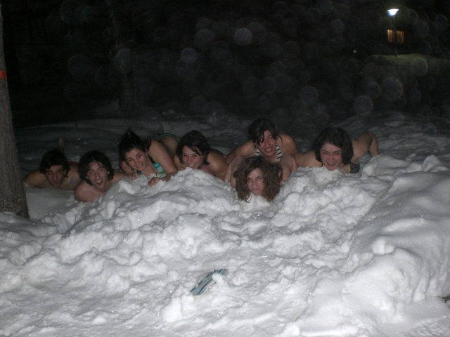 Volvimos a casa bastante cansados pero con ganas de jugar en la nieve, así que durante un par de horas estuvimos bajando cuestas en trineos, con bastantes caídas más y menos dolorosas, guerra y lucha en la nieve, salto desde el tejado a la nieve… Luego cenamos un arroz a la cubana y otras copillas para rematar el día, ah, y por fin la vimos, alguien salió a fumar y entro gritando, ¡la aurora, la aurora! Salimos, miramos al cielo y la vimos, una especie de arcoiris verdecino dibujaba un arco en el cielo, yo me esperaba más, pero fue bonito.