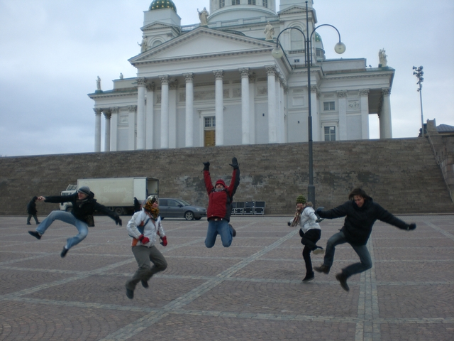 Vimos Helsinki mientras nevaba en abundancia, visitamos el estadio de futbol, un par de catedrales, el puerto, etc. En el puerto paramos a descansar un rato y yo, que ahora sentía el sol en mi nunca me dormí un rato, luego fuimos al encuentro de Guille y Tere a la estación de tren, cogimos un barco y fuimos hasta una isla “Suomelinna” donde pasamos un par de horas. Luego volvimos les enseñamos a Guille y Tere la ciudad, básicamente por donde nos habíamos movido e hicimos unas cuantas fotos más.