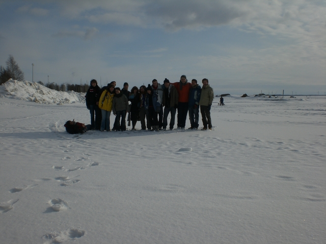 Cenamos en el comedor verduras, con patata y carne, hicimos un poco de sobremesa y los más valientes nos preparamos para lo peor. Sauna y baño ártico en un agua que se encontraba a -1.5 ºC. Fuimos a casa a cambiarnos, corrimos al a sauna donde estuvimos un poco mentalizándonos, establecimos como íbamos a meternos en ese infierno helado y quien iba a hacer fotos. Salimos de la sauna corriendo a una temperatura ambiente de unos -13ºC, nos acercamos al lago y fuimos bajando uno por uno, la verdad es que no era tan horroroso como era de esperar, lo peor, la salida. Volvimos corriendo a la sauna donde calentamos los doloridos pies y luego salimos a rebozarnos por la nieve, ¡eso si que dolió!. Me tiré en plancha y sentí como si mil clavos helados me arañasen el torso (sí, estoy exagerando un poco… :) ). Volvimos a la sauna, nos duchamos y volvimos a casa.