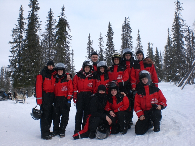 Domingo 17 Madrugón a las 7:50, ducha y desayuno a toda prisa para ponernos rumbo hacia Sariselkä, lugar situado a 40 kilómetros al sur de Ivalo, 70 de Inari donde paramos a pagar las actividades (nada más y nada menos que 180 eurazos) y donde pasamos el día haciendo actividades. Llegamos muy puntuales y tras enfundarnos en unos monos de nieve, con pasamontañas, manoplas y hasta casco, hicimos dos equipos.