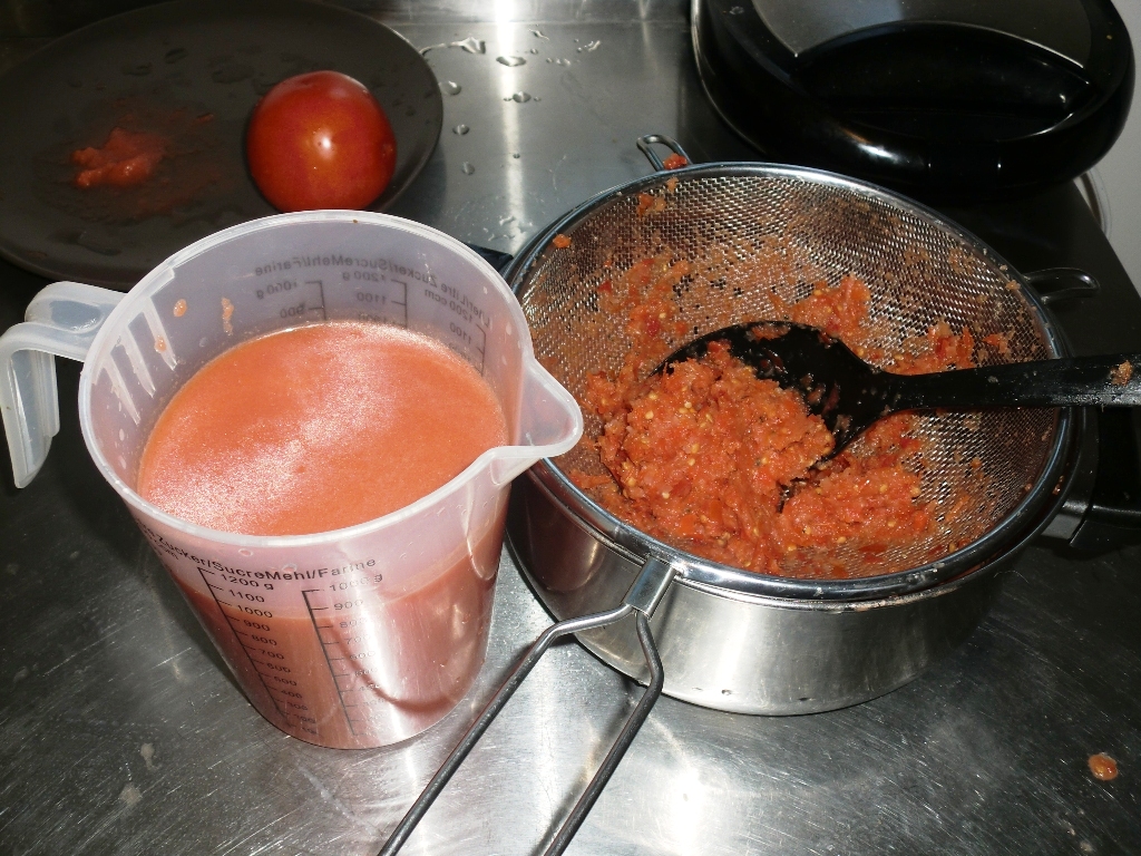 Si queremos que quede mucho más fino, deberíamos pasar todo por el chino, yo como aquí no tengo lo que hago es utilizar un colador, verter la mezcla e ir removiendo con la cuchara y apretando para que caiga todo el jugo.
