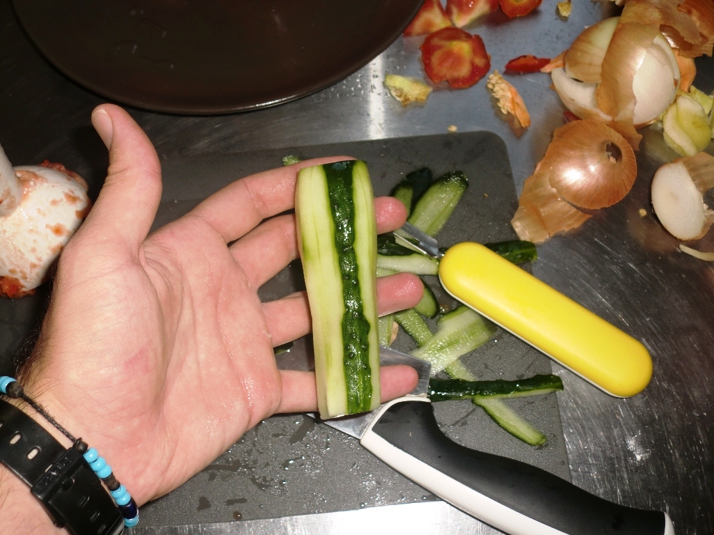 La preparación es extremádamente sencilla, lo primero que haremos será lavar todos los vegetales, pelamos el ajo, la cebolla y el pepino al que es recomendable dejarle una rayita de piel que le dará un toque especial. Hay gente que escalda los tomates para poder pelarlos, la verdad es que a mí me gustan con piel que además es donde se encuentran las vitaminas, pero bueno entiendo que haya gente a la que no le gusten los pellejitos, de todos modos luego os enseño un truco para no tener que perder tiempo escalando.